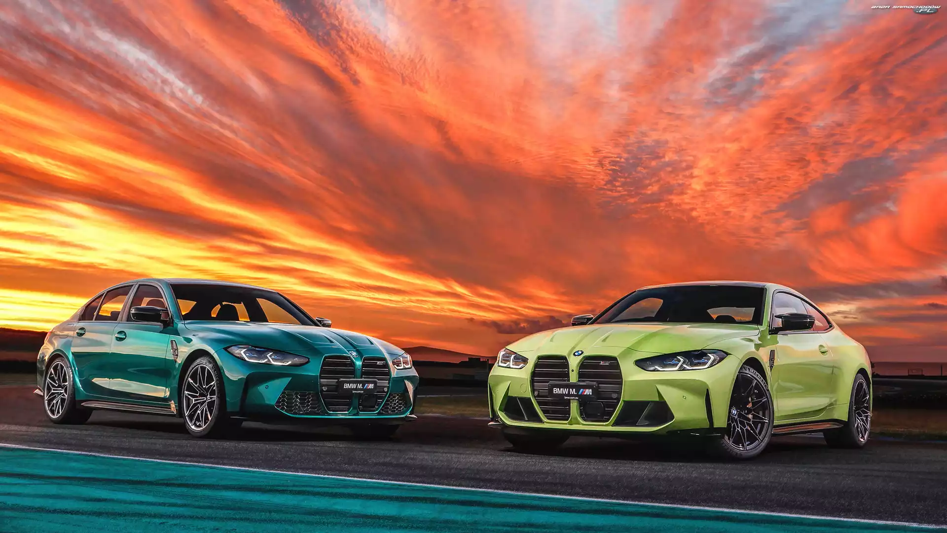 2021, Zielone, Dwa, Limonkowe, BMW M4 Competition Coupe G82, Samochody, BMW M3 Competition Sedan G80- Zdjęcia samochodów